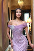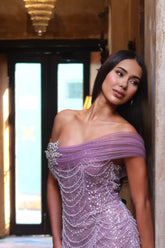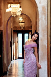 Vestido largo en rosa vintage con mangas estructuradas caídas y pedrería completa.